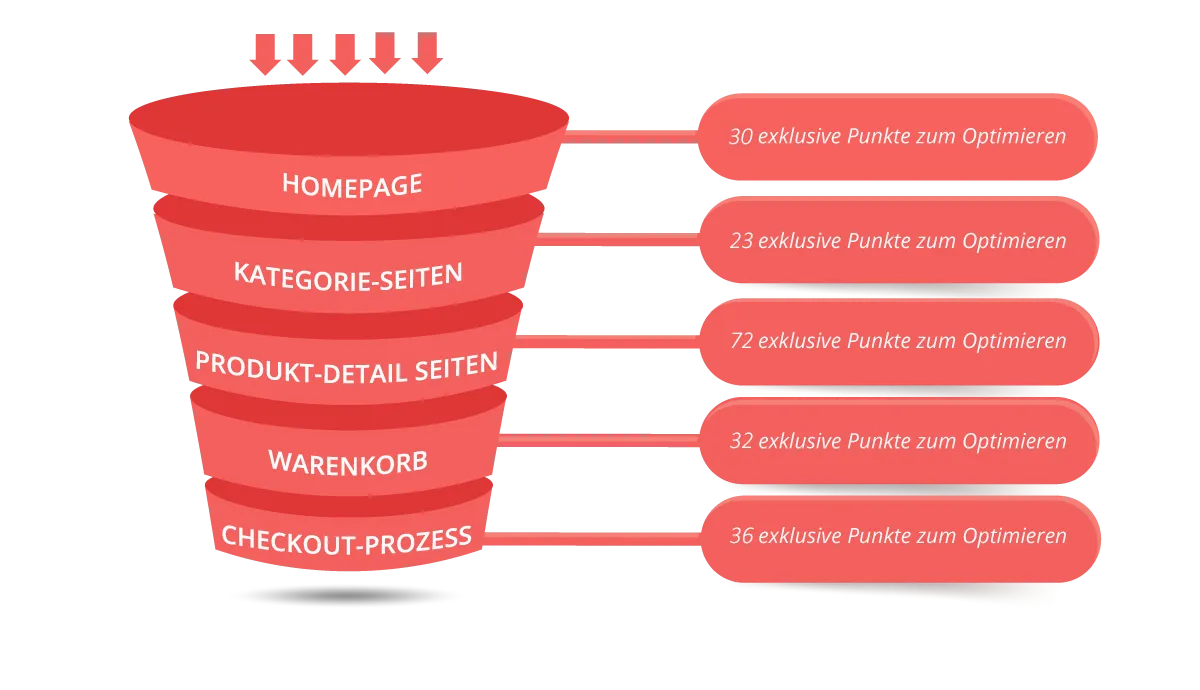 Mit der Conversion-Checkliste hast du die Möglichkeit, jeden einzelnen Schritt in deinem Shop, von Landingpage bis Checkout-Page, genau unter die Lupe zu nehmen.